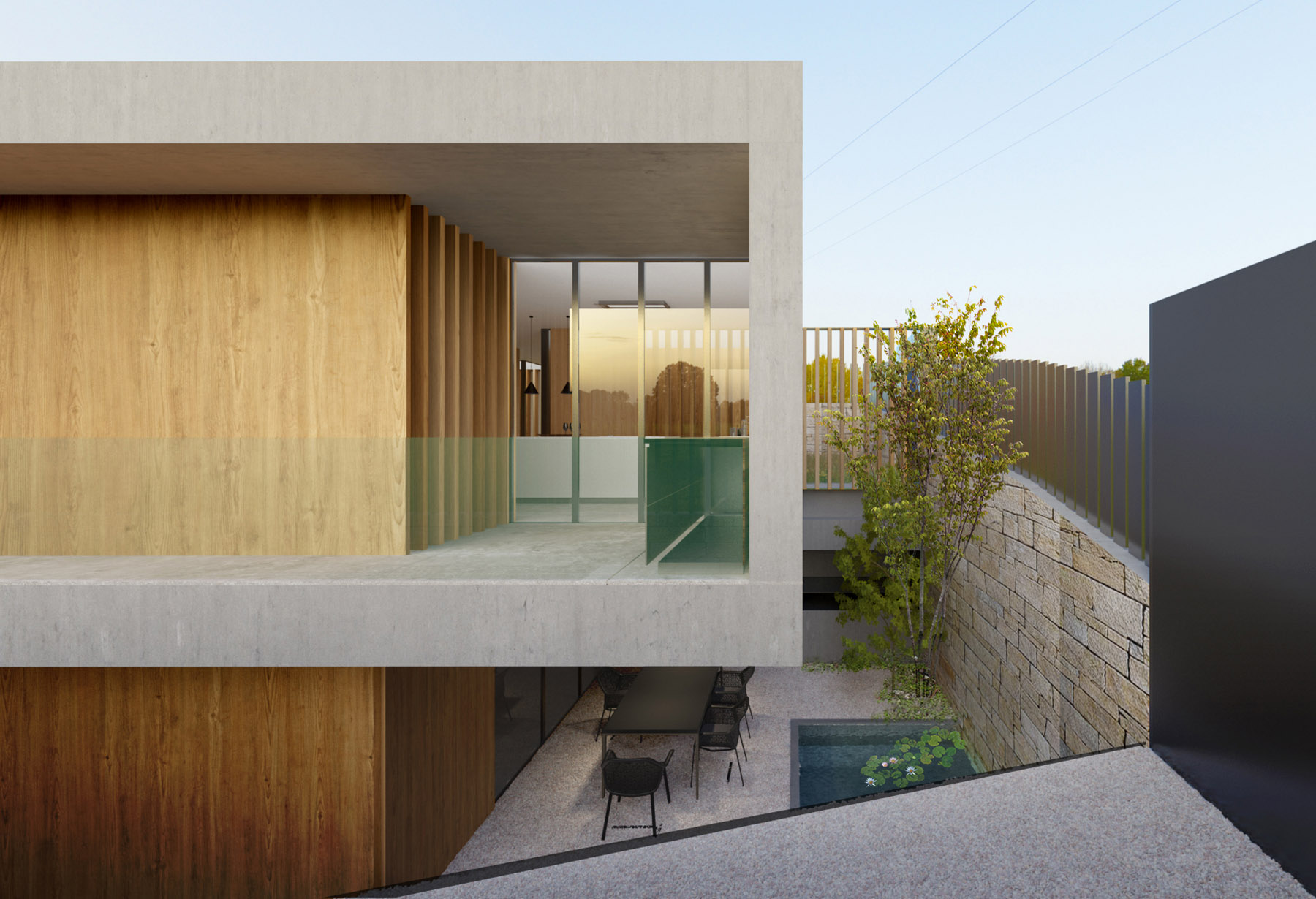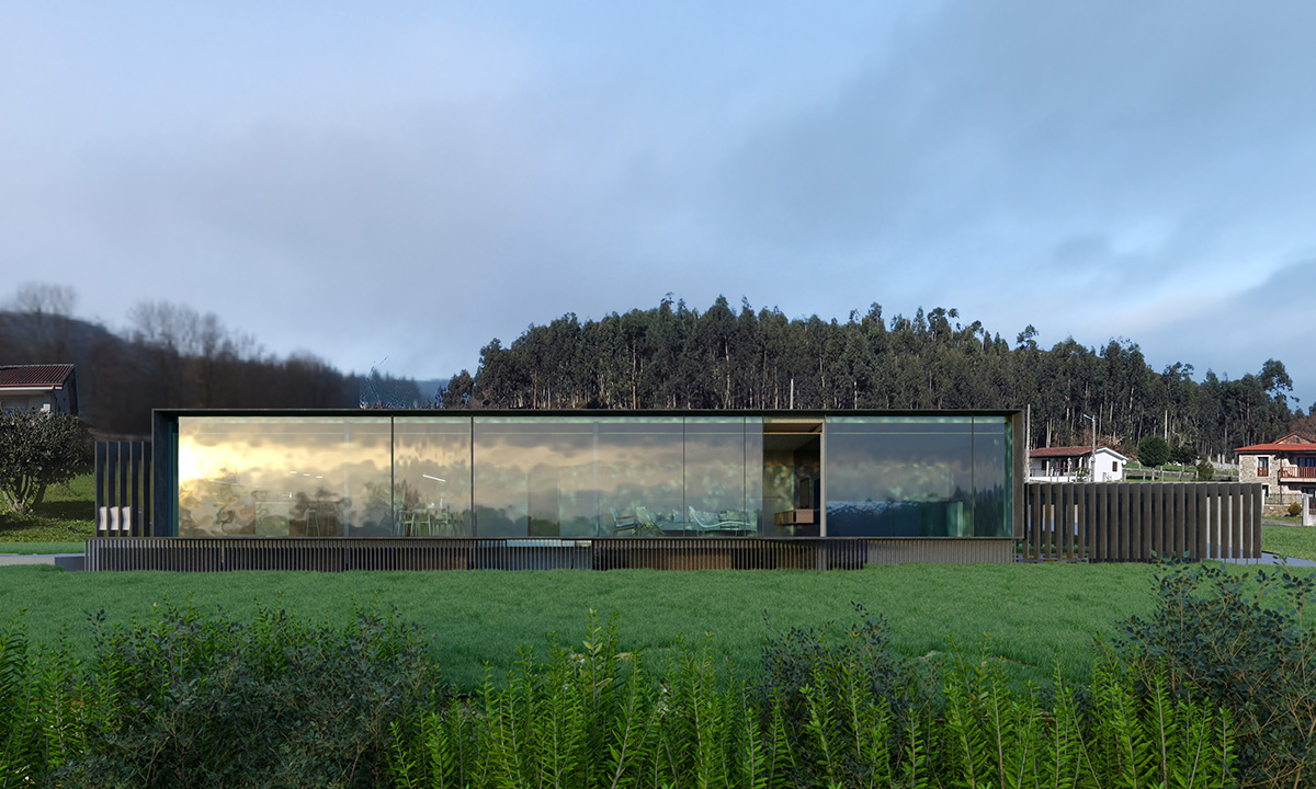 «UN PATIO ALREDEDOR DE UNA CASA». Os presentamos las primeras imágenes exteriores del proyecto para vivienda unifamiliar en Oleiros, A Coruña. Un espacio perimetral exterior se infiltrará y romperá el volumen a modo de patios que darán luz al interior de la vivienda. La casa tiene sentido sólo cuando se relaciona con sus espacios exteriores…