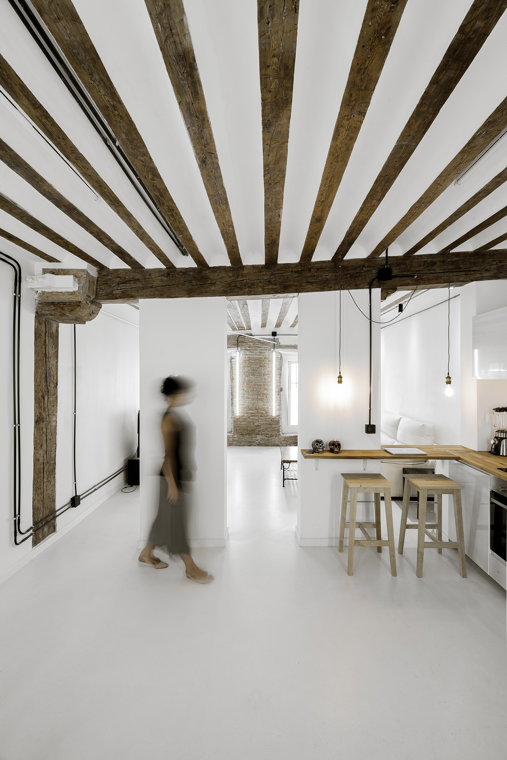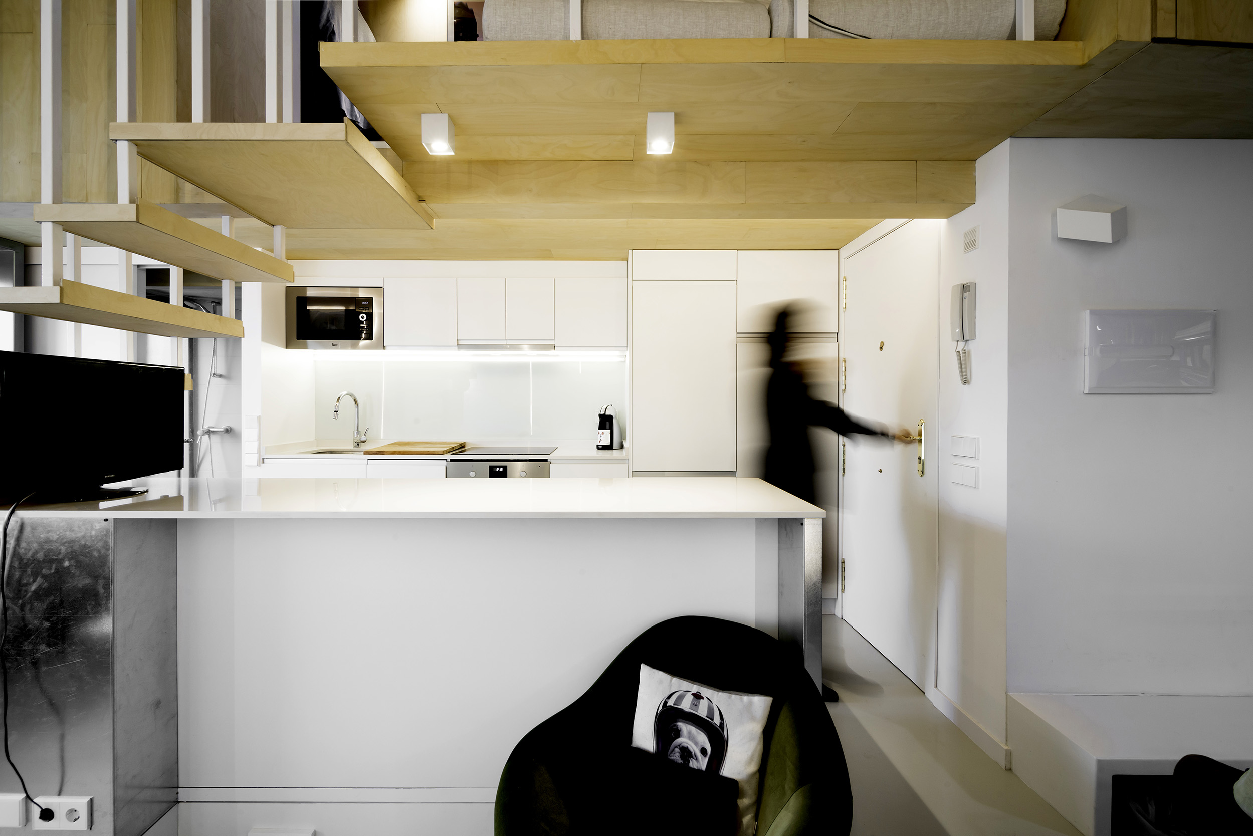 Por fin tenemos las fotografías finales de nuestra Reforma Duplicada… Una recreación de las cubiertas de Madrid en un cálido interior de madera. El mal estado existente requería de un trabajo integral en su interior. Frente al concepto de ampliar superficie en horizontal, aprovechamos la gran altura existente para crear un altillo en doble altura sobre el salón, multiplicando los usos en vertical. Contrastando con un suelo neutro de resina gris y muebles de madera en blanco, el techo, escalera y altillo se realizan de madera, para proporcionar un ambiente cálido al interior. El techo de madera se convierte en el protagonista del proyecto, siendo diseñado mediante geometrías triangulares que nos recuerdan a las cubiertas del Madrid tradicional que se ven desde la casa, rompiendo así la frontera visual entre interior y exterior. La ventana principal se realiza con carpintería de aluminio en blanco con un doble marco de chapa de acero que se puede utilizar desde el interior y el exterior, teniendo una puerta de salida a una terraza con vistas sobre todo Malasaña, esta vez bajo un cielo de madera.