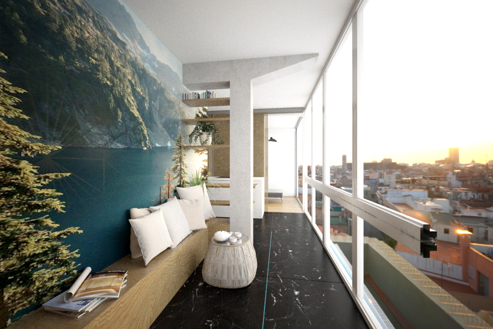 Nuestro trabajo más especial será la conversión de una terraza ahora obsoleta y sin utilizar en un Jardín de Invierno, una zona con múltiples posibilidades y capaz de transformarse continuamente. Los pavimentos de baldosa hidráulica y el uso de wallpaper, así como el diseño de un asiento y mesa corrida de madera, tratan de dotar carácter semiexterior a un espacio climatizado, pero que se puede abrir completamente al maravilloso paisaje urbano que rodea a la casa.
