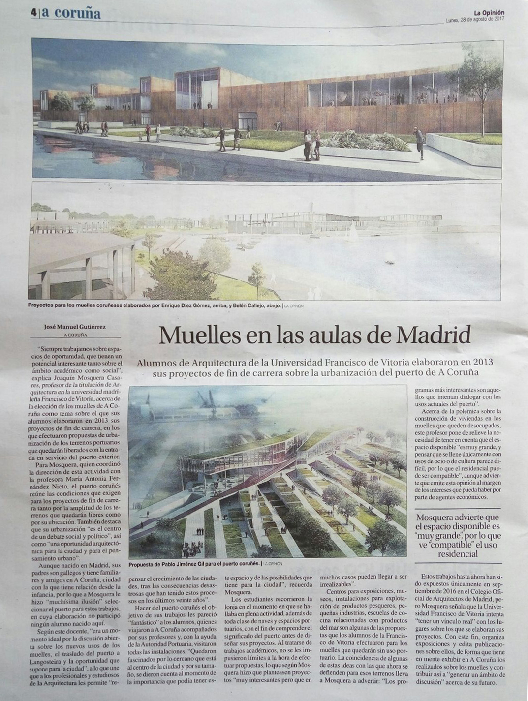 Joaquín es entrevistado hoy en el periódico La Opinión, hablando de su trabajo como profesor en la Universidad Francisco de Vitoria con el proyecto situado en la interesante ciudad de A Coruña y su puerto. Debido al movimiento de las principales instalaciones fuera de la ciudad, nuevas oportunidades emergen y la arquitectura debe ser principal protagonista!