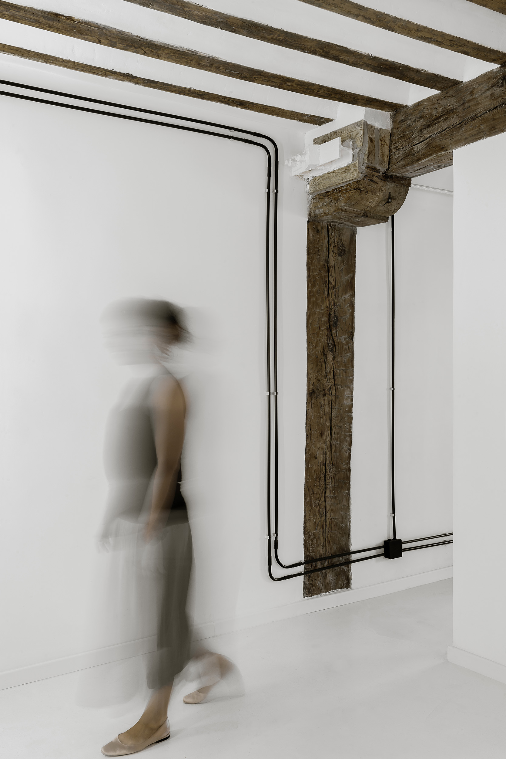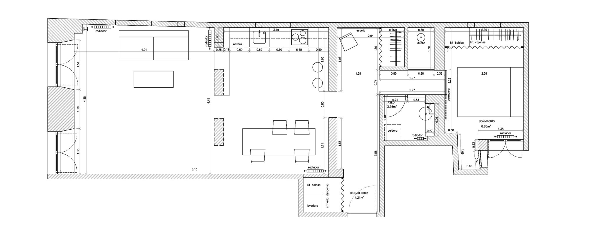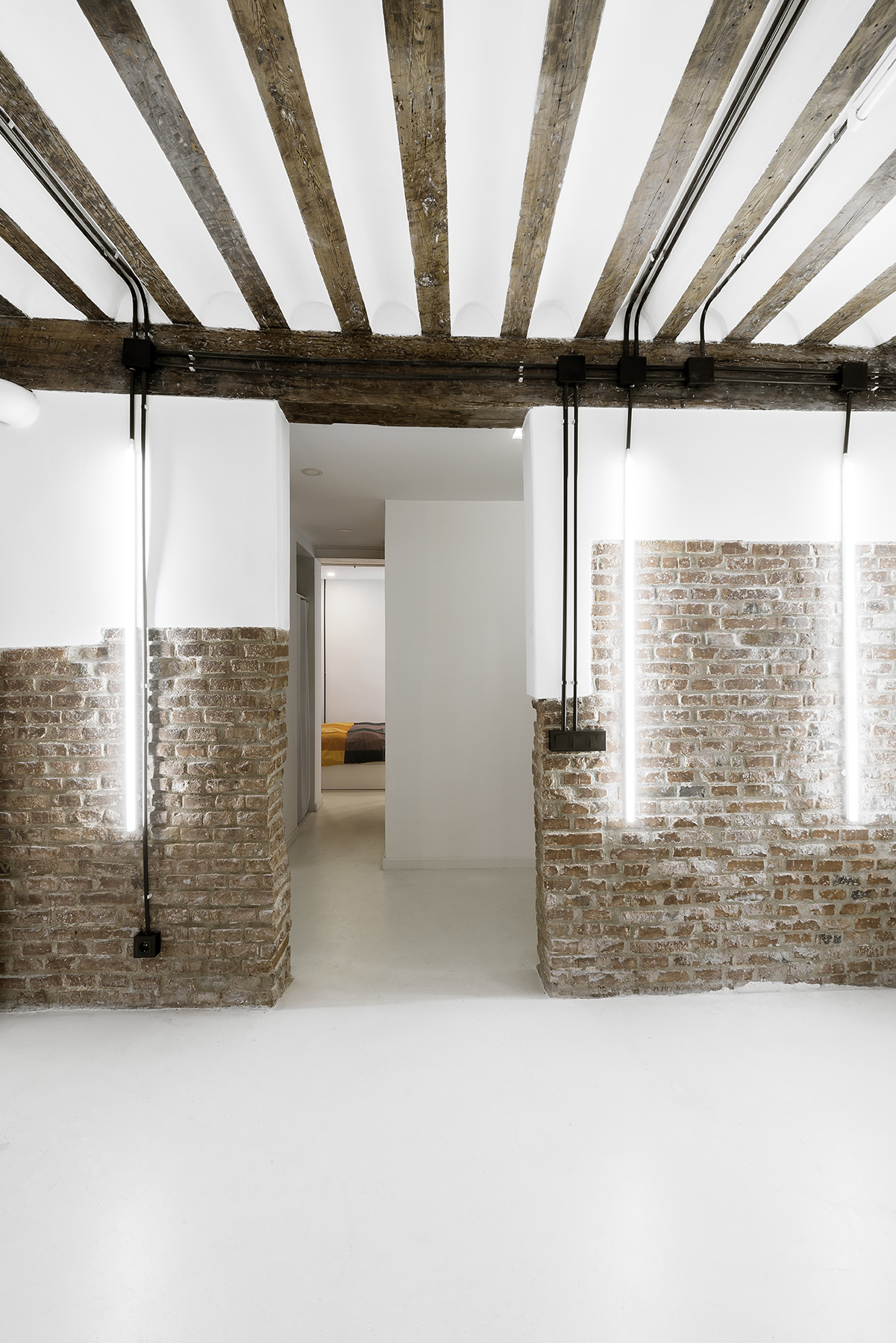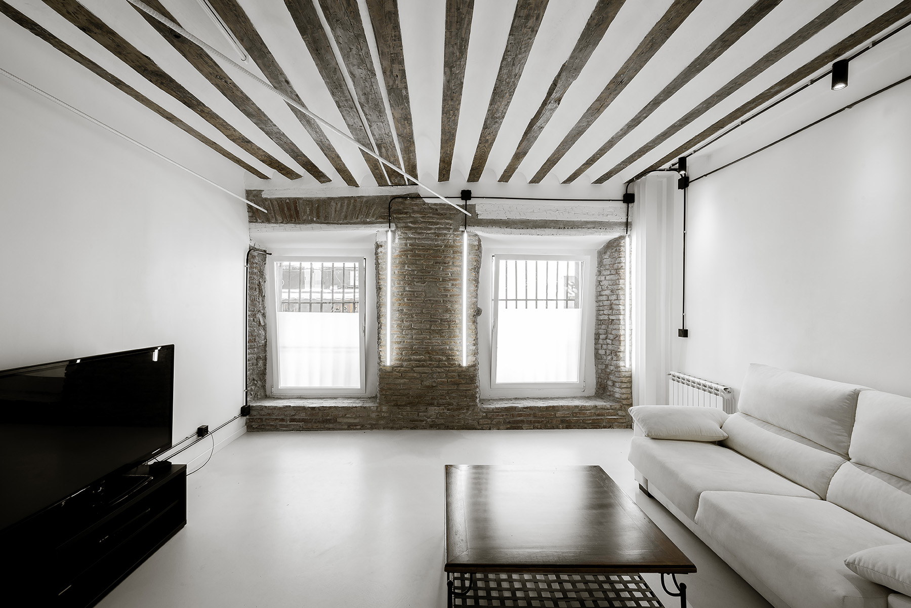 Con este proyecto para un músico en el centro de Madrid, en el barrio de La Latina, presentamos la cuarta parte de nuestras Arquitecturas que Multiplican. En este caso, se trabaja sobre un estado preexistente excesivamente compartimentado y oscuro, típico de plantas bajas en el centro histórico. Tras un estudio pormenorizado de la estructura existente de madera y su estado, se parte del principio de revalorizar los elementos visualmente más característicos, que son la estructura de madera y los muros de carga de ladrillo. A partir de ahí, la diafaneidad es la herramienta utilizada para introducir la luz y multiplicar los usos interiores en la parte más pública de la vivienda; Los espacios más importantes, por lo tanto, cumplen las funciones más tradicionales de una vivienda (salón, comedor, cocina) dependiendo de su amueblamiento, pero también disfrutan de la multiplicación de funciones posibles. Por contraste, la habitación, núcleos húmedos y armarios se compartimentan en la parte contraria de la vivienda.