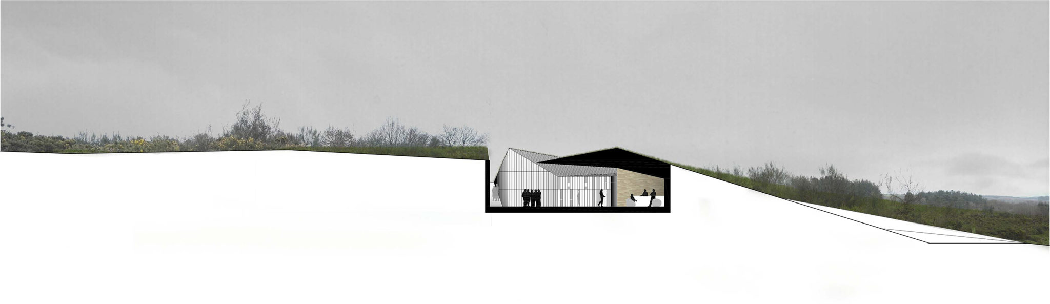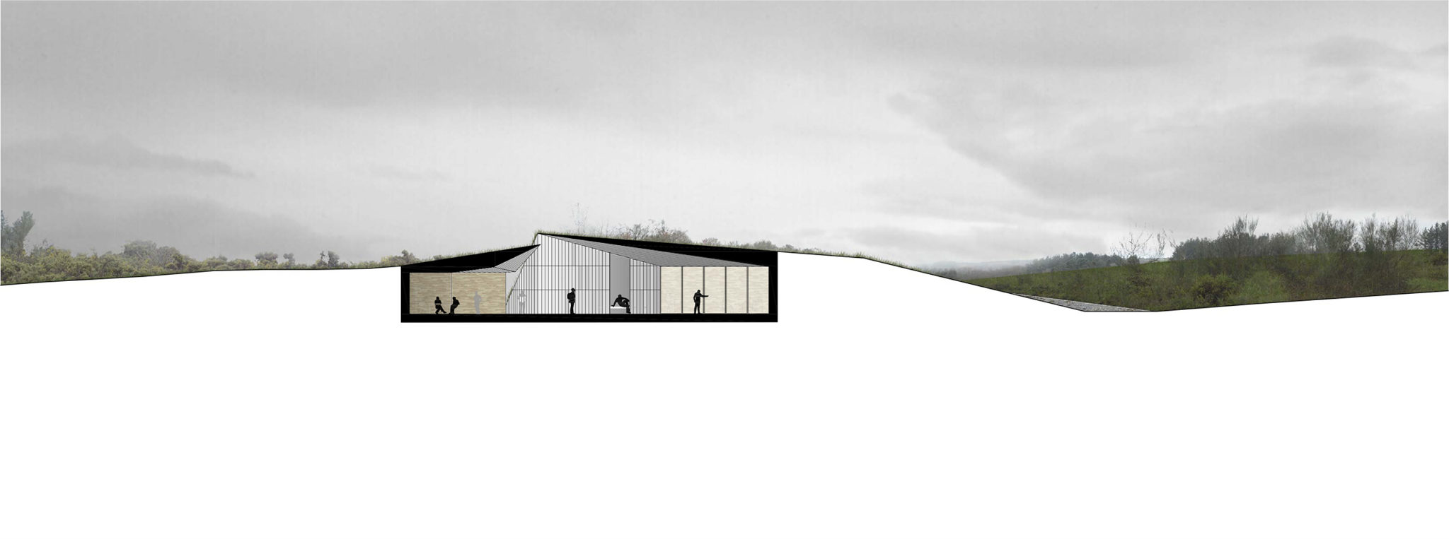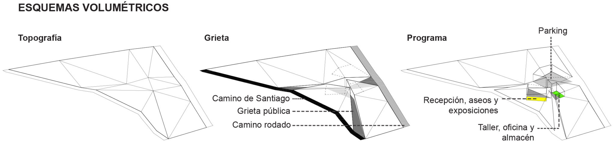 El proceso de formalización del proyecto incluye entonces tres pasos: una recreación volumétrica naturalizada, una grieta para las circulaciones y accesos y una perforación interior para contener el programa.