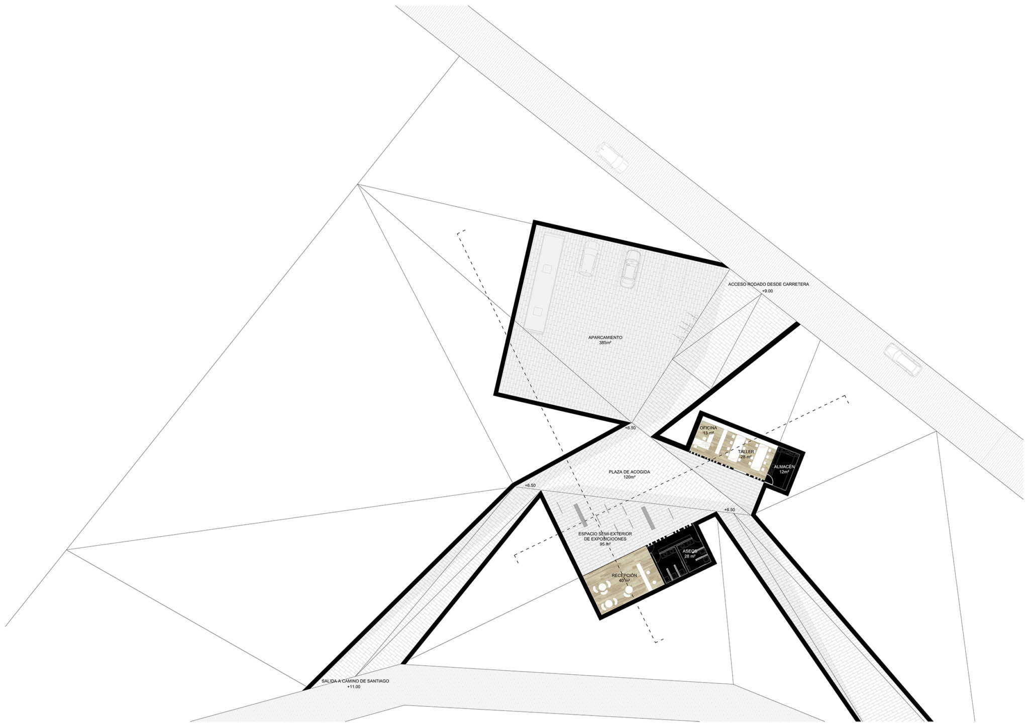 Debido en gran parte a las importantes diferencias de cotas altimétricas, y a los dos frentes principales del solar al Camino y a la carretera, las circulaciones se dividen en tres: un acceso en el sentido de llegada del peregrino a cota inferior de la parcela (0.00 m.), una salida del centro al camino en su cota superior (+9.00 m.), y un acceso de vehículos protegido de las vistas desde la plaza interior (+9.00 m.). Las tres confluyen en el espacio central de la plaza, a +6.50m.