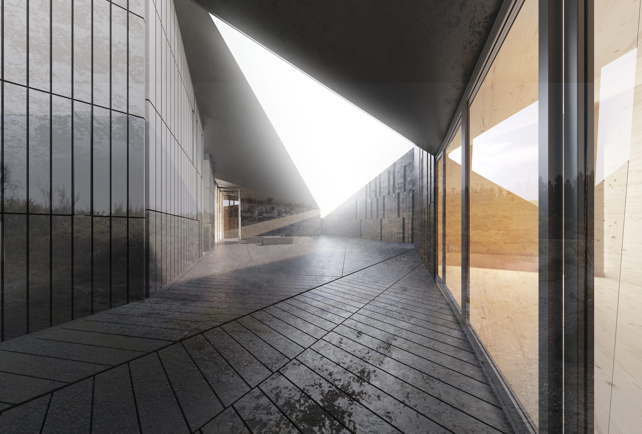La plaza interior de la grieta es el espacio de reunión principal y el lugar central de la propuesta, convirtiéndose así en claro referente en el camino. Los tres programas generales vuelcan a él, accediéndose mediante un espacio cubierto que nos recuerda a las galerías cubiertas gallegas protegidas del clima, dándonos la bienvenida a los programas interiores y generando un espacio que vale de descanso fundamental en el recorrido del Camino así como de otros usos públicos como exposiciones o presentaciones eventuales.